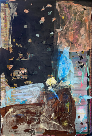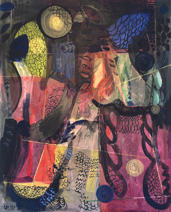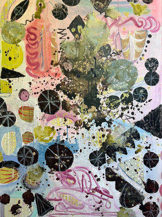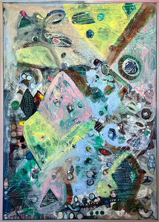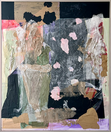 På lærred arbejder jeg i mixed media – blandt andet med stof, papir, akryl, plastik, karton og akryl. Overfladen folder sig ud i mønstre, symboler og fragmenterede fortællinger, hvor det spontane møder det sanselige. Værkerne balancerer mellem orden og tilfældighed – som indre landskaber i konstant bevægelse.